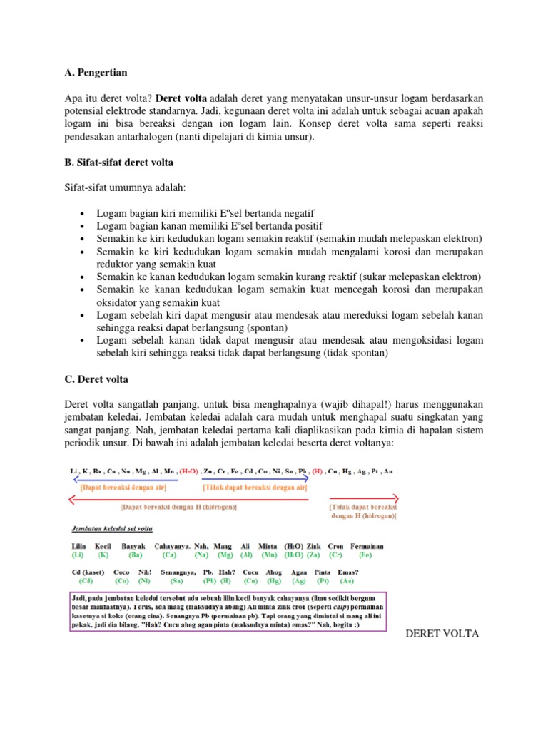 Jembatan Keledai Deret Volta Youtube - Deret volta diurutkan berdasarkan urutan potensial reduksi semakin ke kiri, semakin kecil sehingga sifat pereduksi semakin kuat (logam semakin reaktif atau semakin mudah meengalami oksidasi).